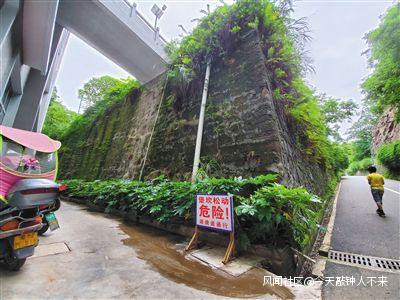 新京報記者6月下旬在新晃走訪時瞭解到,堡坎的工程質量不好,直到現在,兩側山坡上還不時有石塊掉下來,路旁已經設置了“堡坎鬆動危險!請繞道通行”的提示牌。