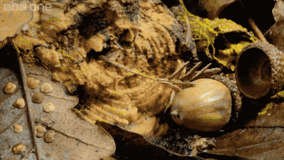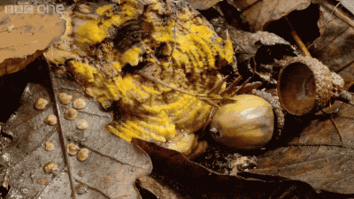 如果環境不適宜生存,這些假原生質團會開始一種更為神奇的行為,它們開始變形成蘑菇一樣的東西。這是黏菌繁殖的最後階段——孢堆果,類似於蘑菇進行繁殖的子實體。