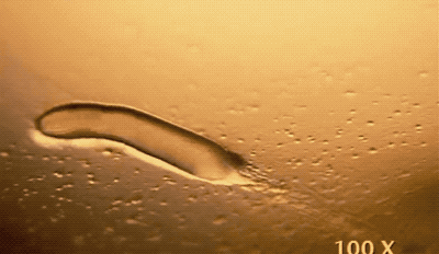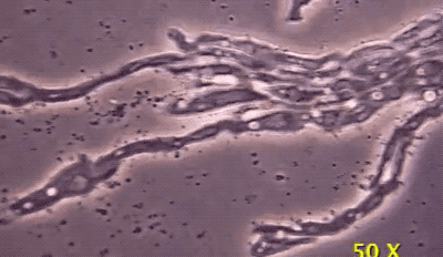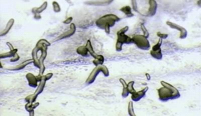 與此同時,假原生質團開始變形,它們開始變得像鼻涕蟲,一邊蠕動一邊尋找新的棲息地。在尋找新的定居地點的時候,它們也會像真的鼻涕蟲那樣,留下一條黏糊糊的痕跡。