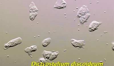 再來看看盤基網柄菌(Dictyostelium discoideum)這種黏菌有趣的集羣和生殖行為。