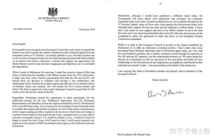 這封延期脱歐信的格式和文字都被英國議員規定得死死的,且最晚要在10月19日23點之前,向歐盟寄出。