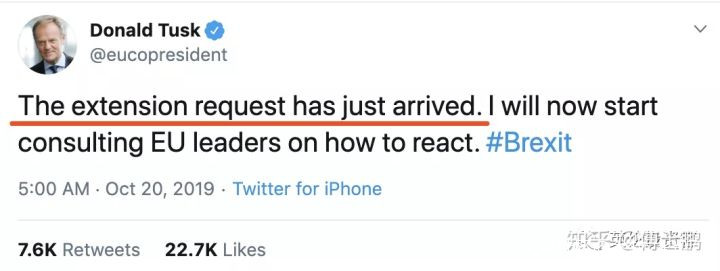 歐洲理事會主席圖斯克在推特上寫道:“我剛剛已經收到英國延期脱歐申請,我現在會開始和歐盟領導人商量如何回覆。”
