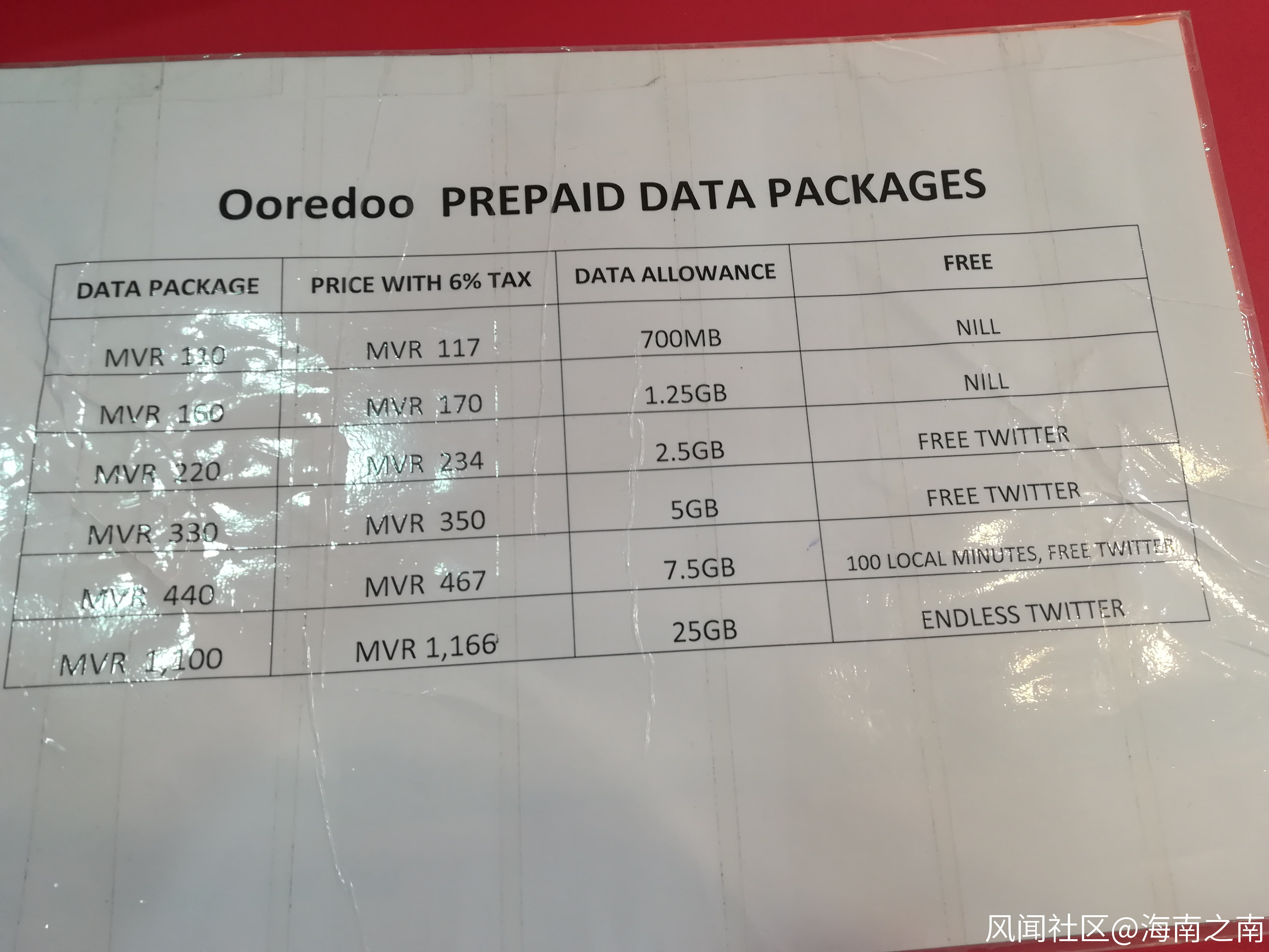鄙人的簽證有效期1個月,返程飛機票是20天以後,所以辦了一個當地234MVR(大概100元人民幣)2.5GB流量月套餐,OOREDOO的。OOREDOO是當地的一個通訊服務商,大概相當於中國移動或是聯通這種。每次打了電話,會給你發個短信,告訴你花了多少錢。我打了一個26秒的電話,當地打當地,收費是0.45拉菲亞(2毛人民幣的樣子)。