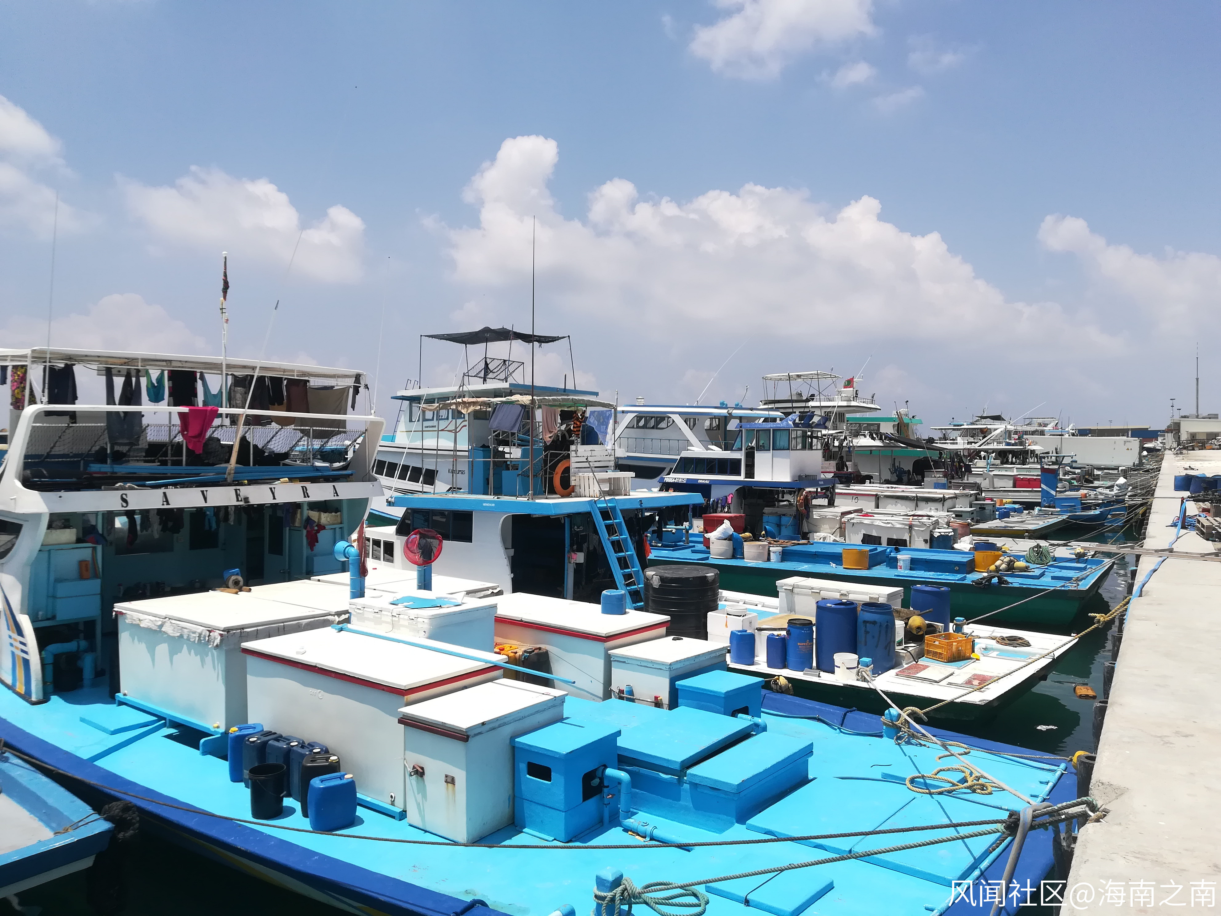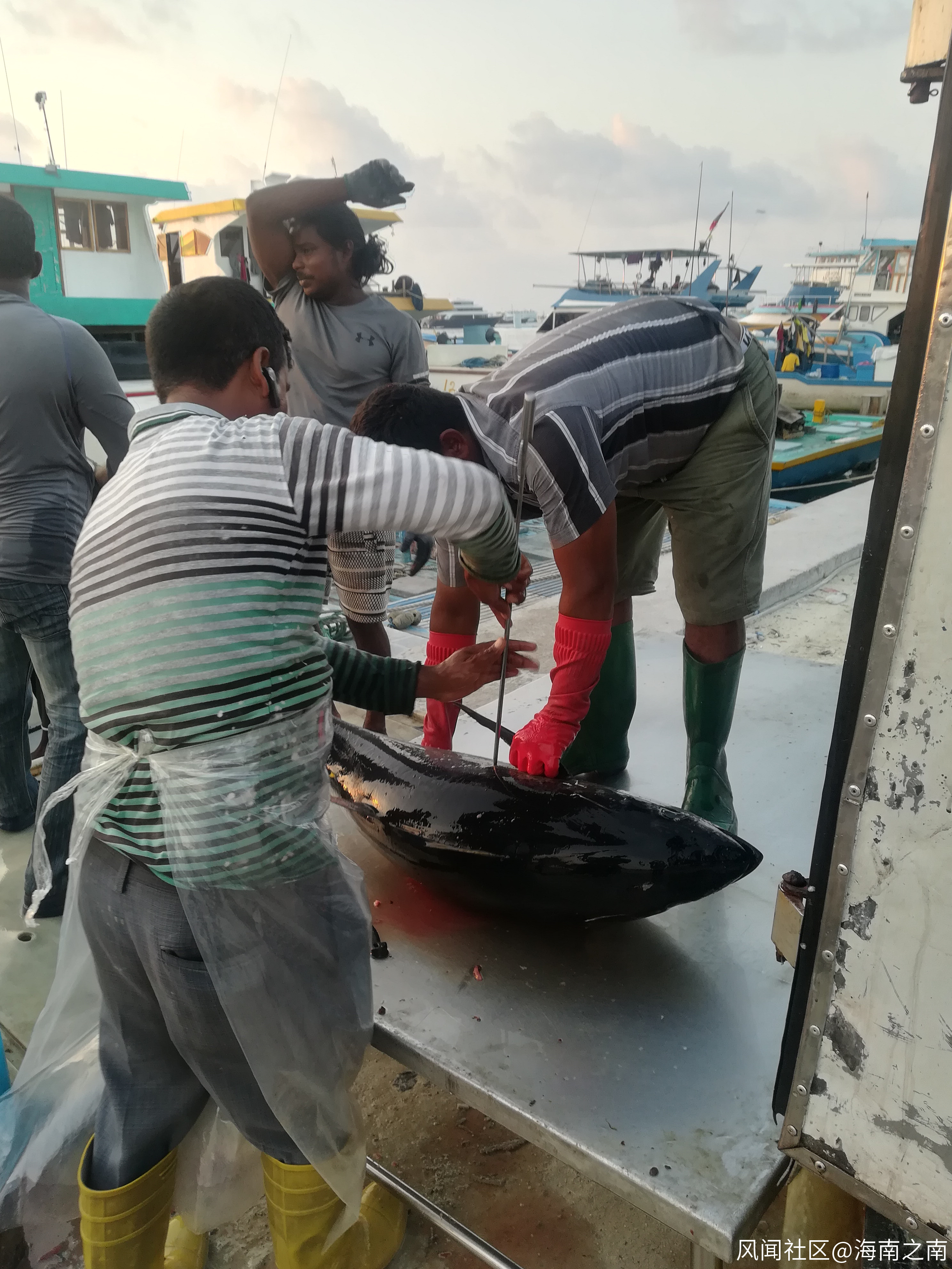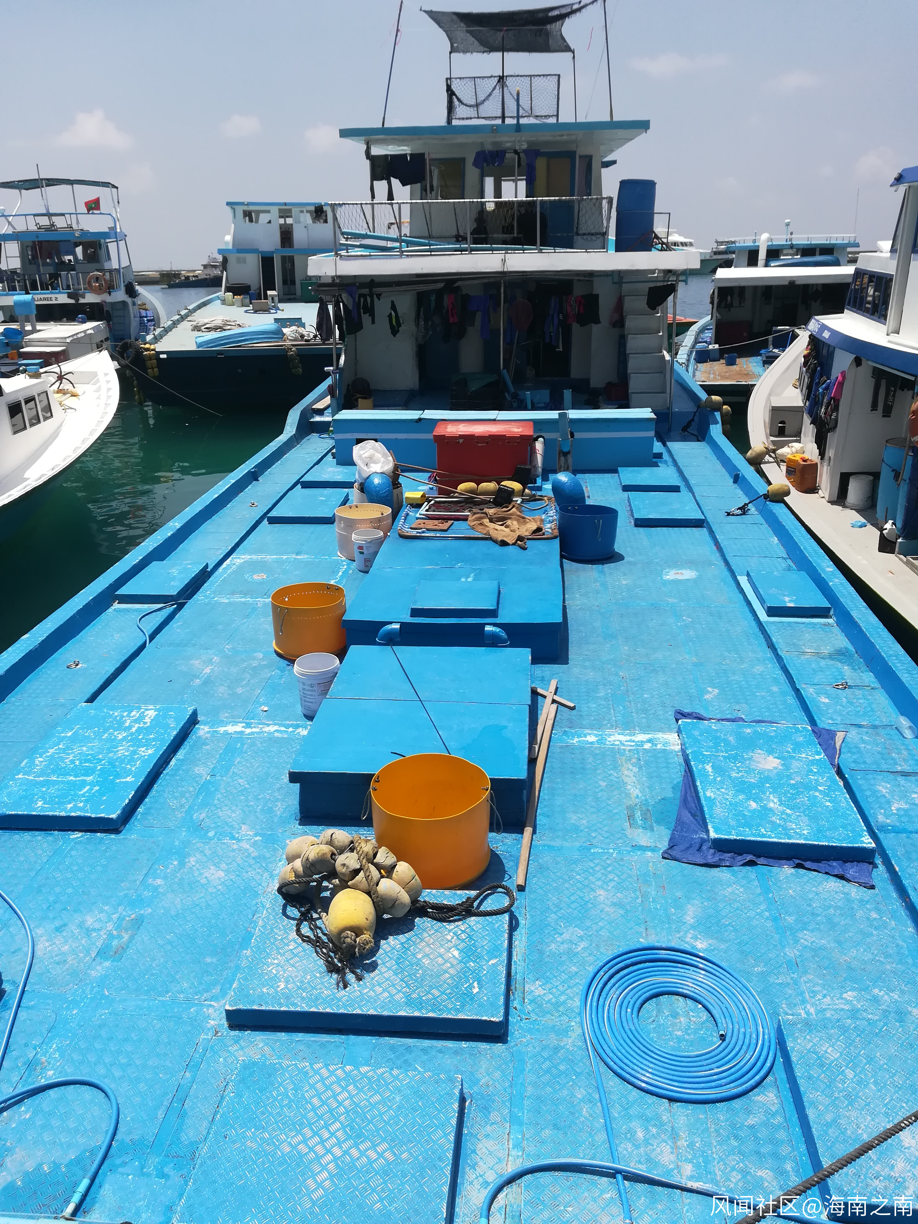 馬爾代夫的漁船很奇怪,方方正正的,有點像麻將,用板材製成,甲板下面如同針線盒是一格一格的。這種形狀的船,很難長距離航行,優點應該是比較穩定,抗風浪。船上也看不到漁網,也沒有捲揚機這樣的設備,難道是捕魚是靠釣嗎?問題是這麼大的魚是很難釣起來的,而且也看不到釣具。