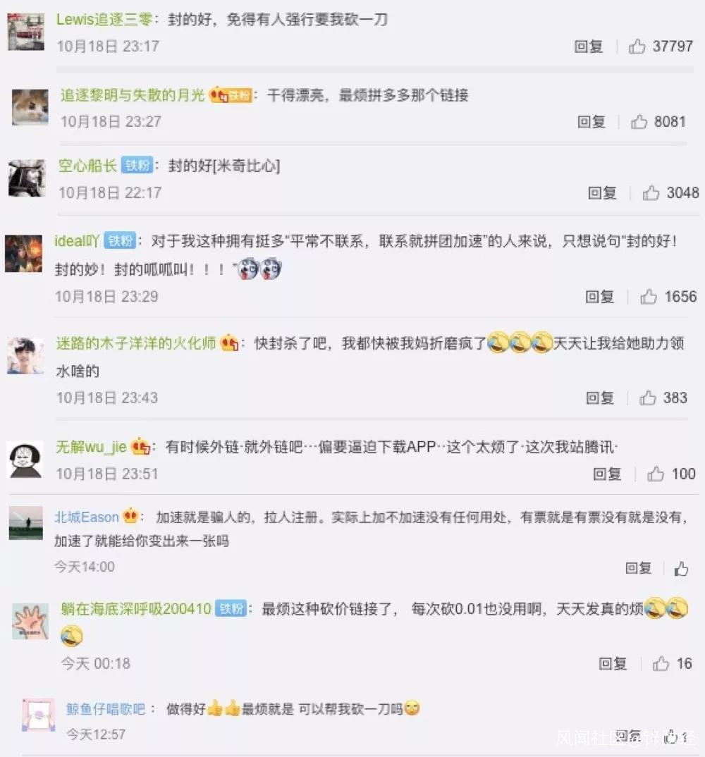 很多人都有過在微信朋友圈和收到朋友發來的拼多多“砍價”鏈接的經歷,要打開鏈接必須要下載拼多多App或者接入到拼多多小程序中。而這一操作下就有泄漏個人信息的風險。礙於看在朋友或者親人的關係上,不得不去這樣做,以至於讓很多人對其模式厭煩至深。