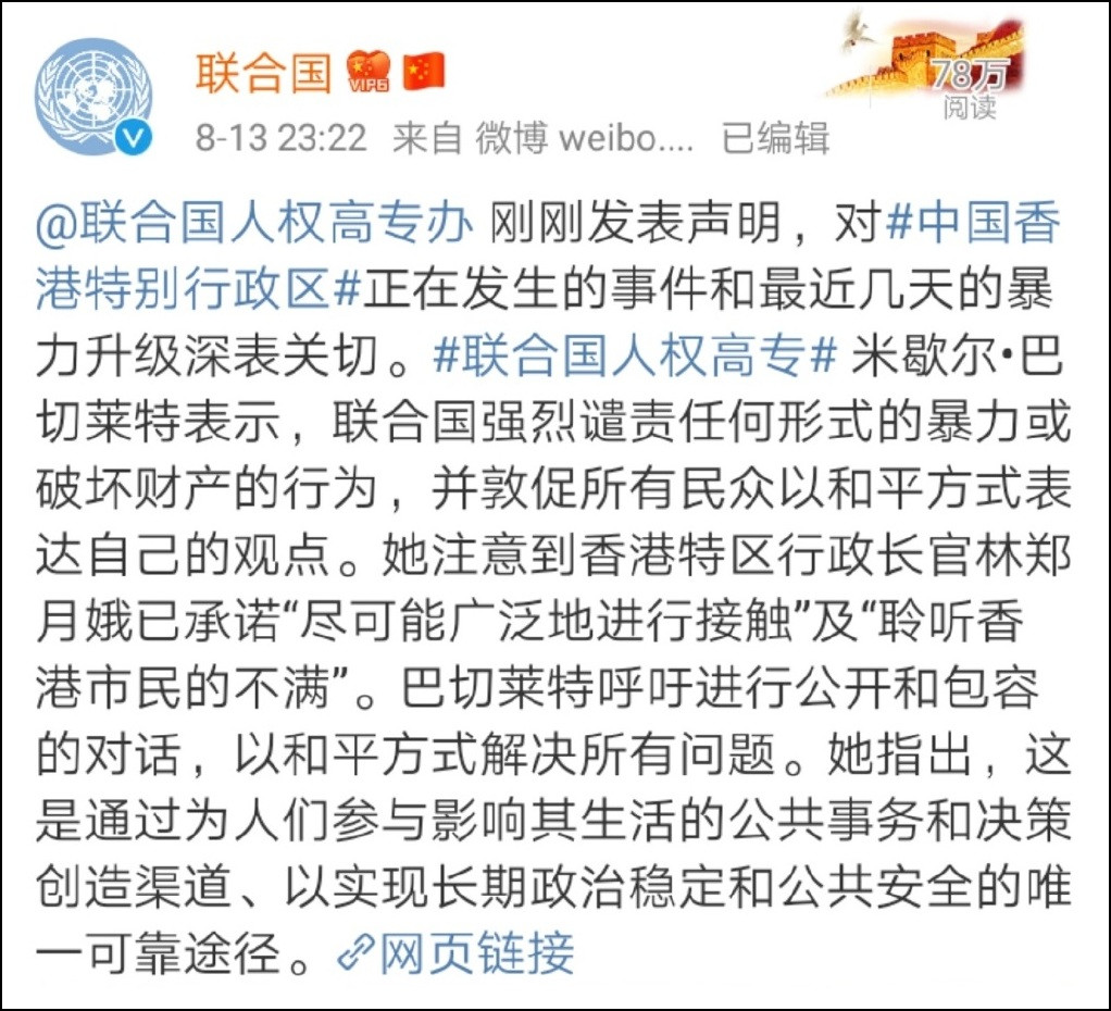 今年8月13日晚,聯合國的官方微博發佈了一份援引巴切萊特話語的聲明。這份聲明指出,巴切萊特表示,聯合國強烈譴責任何形式的暴力或破壞財產的行為,並敦促所有民眾以和平方式表達自己的觀點。同時巴切萊特還呼籲進行公開和包容的對話,以和平方式解決所有問題。