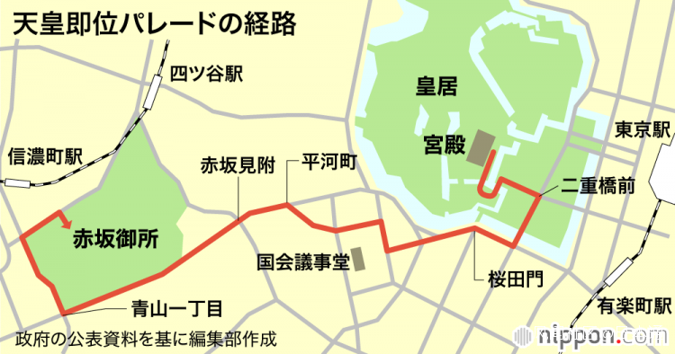 當日下午3點30分開始,“即位正殿之儀”結束之後,天皇夫婦更換常服,進行慶典遊行。天皇夫婦將乘坐豐田特製的敞篷汽車從皇宮宮殿出發,在國民的祝福歡呼聲下前往4.6公里外的赤坂御所(前東宮御所)。