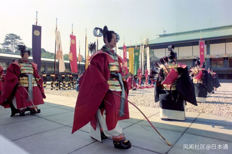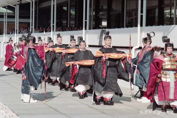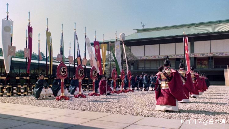 為盡顯儀典威嚴,幡旗前面站着一排“儀仗隊”,他們身穿古代傳統服飾,手持太刀、弓箭與盾牌(稱威儀之物)。扮演“儀仗隊”的是宮內廳的職員。