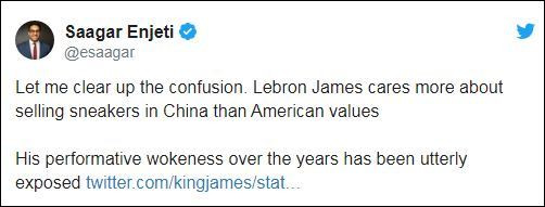 然而在過去的某個時期裏,很多人卻把毛主席的告誡當作耳旁風,投入巨資來引入NBA和好萊塢等美國的文化產品,並且將它們包裝成“不帶有任何政治傾向”的“人類文明成果”。可是在這次NBA風波當中,美國人自己也承認NBA是承擔着輸出西方資本主義價值觀,或曰“美國價值觀”的使命。很多圍攻詹姆斯的人也是指責其沒有很好的輸出美國價值觀,像“國會山”新聞駐華盛頓首席記者兼主持人Saagar Enjeti就指責詹姆斯“更關心在中國賣運動鞋,而不是美國價值觀”:
