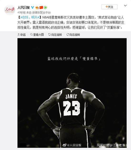 【NBA超級明星詹姆斯日前公開批評莫雷,在美國引發對自己潮水般的攻擊。多名美國國會議員加入了對詹姆斯的圍攻,美國互聯網上更是出現針對詹姆斯的各種羞辱,比如他被畫成抱着100元的人民幣向中國國旗宣誓效忠,他一夜之間成了“拜倒在中共金錢面前”的典型。這個情景給了中國社會一個極其深刻的印象,那就是,原來美國的言論自由真的是假招子,它必須要以政治正確為基礎。也就是説,莫雷支持香港示威,符合美國的政治正確,它就屬於言論自由,需要受到強有力的保護。而詹姆斯批評莫雷,政治正確不過關,就與言論自由不沾邊了。】