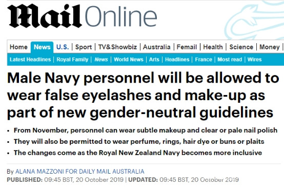 報道稱,根據新的性別平等準則,新西蘭國防軍將對包括男性在內的海軍士兵的儀容儀表規定進行修訂,新規允許所有海軍士兵化淡妝,用透明或淺色指甲油塗指甲,還可以戴假睫毛。此外,他們還可以噴香水或者古龍水,在最多兩隻手指上戴戒指,還可以留辮子和染自然色的頭髮。報道還提到,新規將從11月1日起生效。