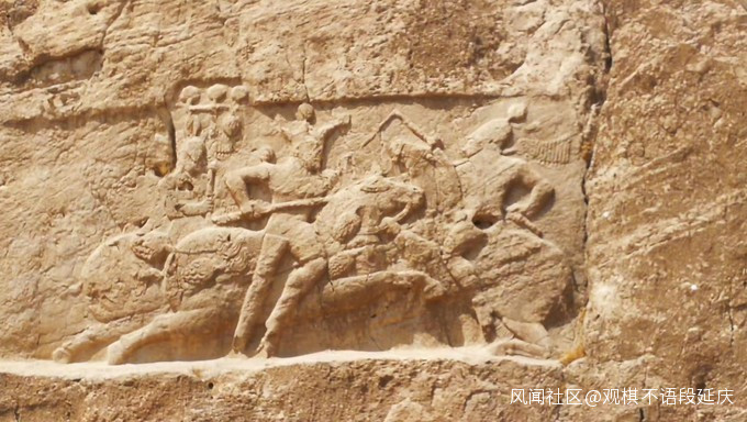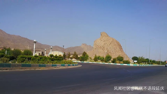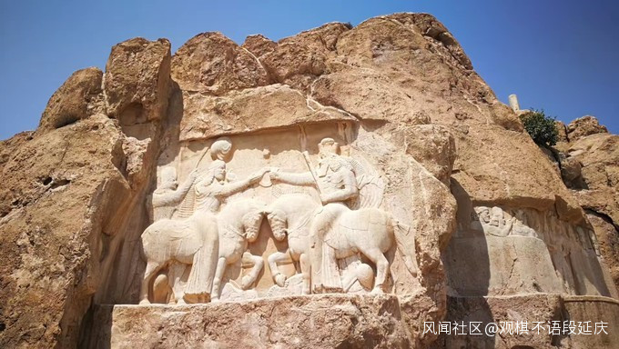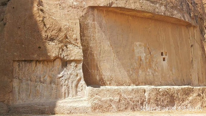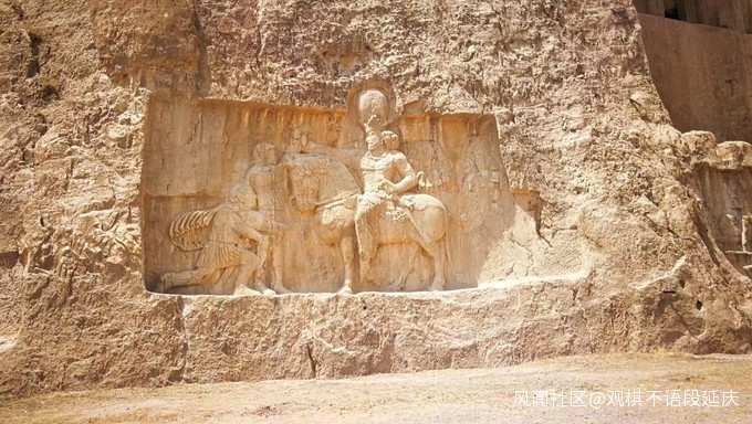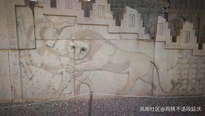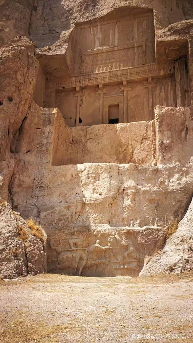 廢棄宮殿後面是一座小山丘,爬上小山,有一個山洞,山洞上方雕刻着馬自達的圖騰雕像,站在洞口的平台,可以俯覽整個波斯波利斯 ,雖是廢墟,仍氣勢磅礴。想一下,這是一座比阿房宮早三百年的宏偉宮殿,和阿房宮一樣,最後被人燒成了廢墟,幸運的是,它留下了遺骸,可以讓我們後人憑弔。
