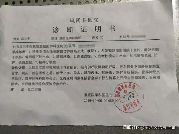 侯桂芝見到姑姑時,她正蹲坐在醫院角落裏不住地哭,細問之下才知道表弟馮三千出事了。經診斷,馮三千被確診為特重型閉合性顱腦損傷並腦疝形成(晚期)、左側額顳頂部硬膜下血腫、繼發性腦幹損傷、蛛網膜下腔出血等。