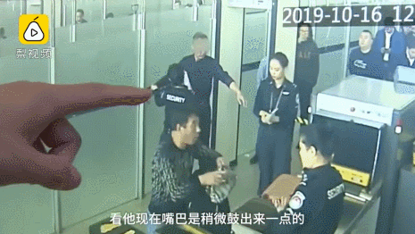 安檢員詢問男子嘴裏是什麼,