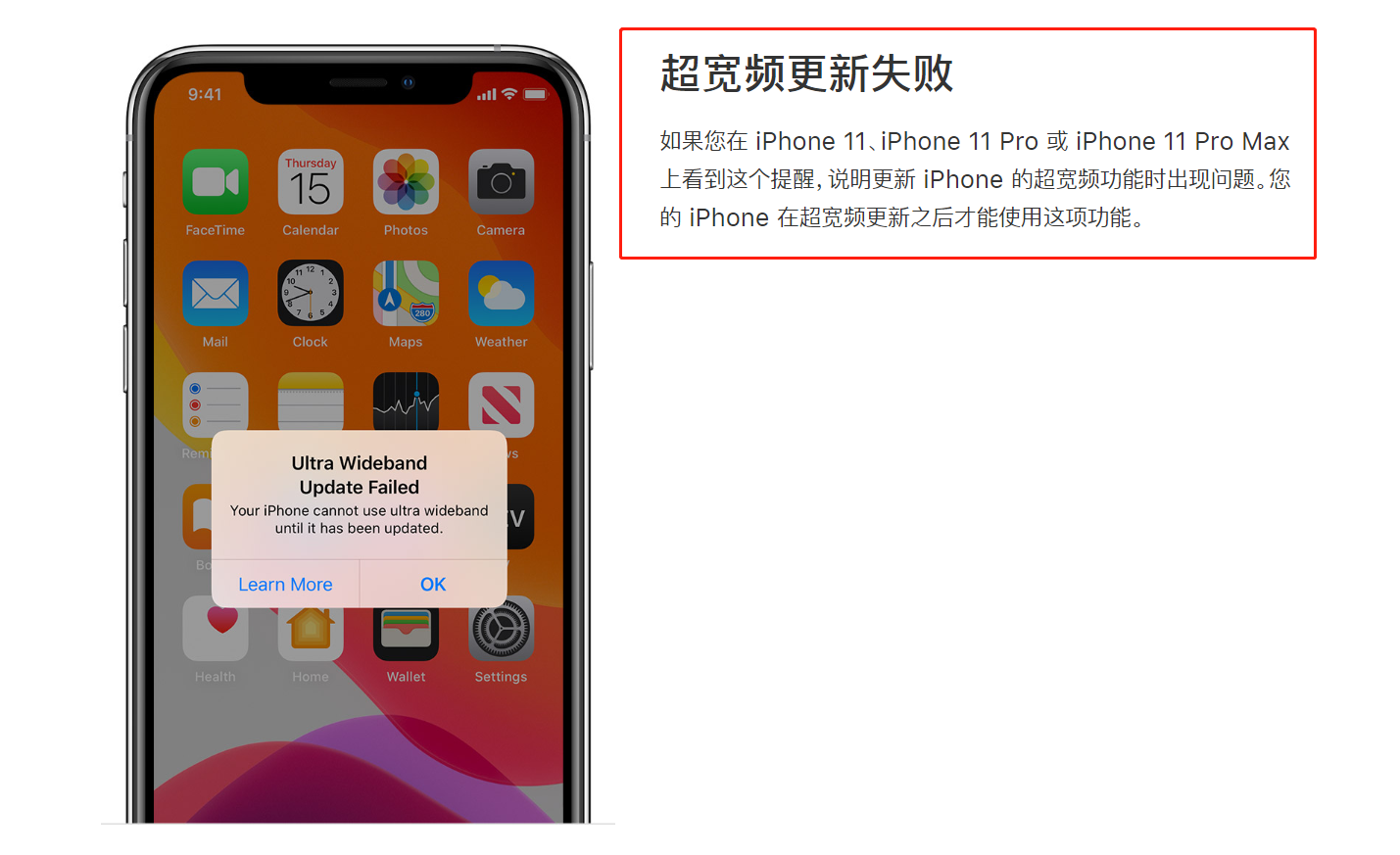 但有國外的 iPhone 11/iPhone 11 Pro/iPhone 11 Pro Max 用户反映,在更新至新系統之後,他們的 iPhone 出現了「Ultra Wideband Update Failed(超寬頻更新失敗)」的提示,彈窗顯示「Your iPhone cannot use ultra wideband until it has been updated.」