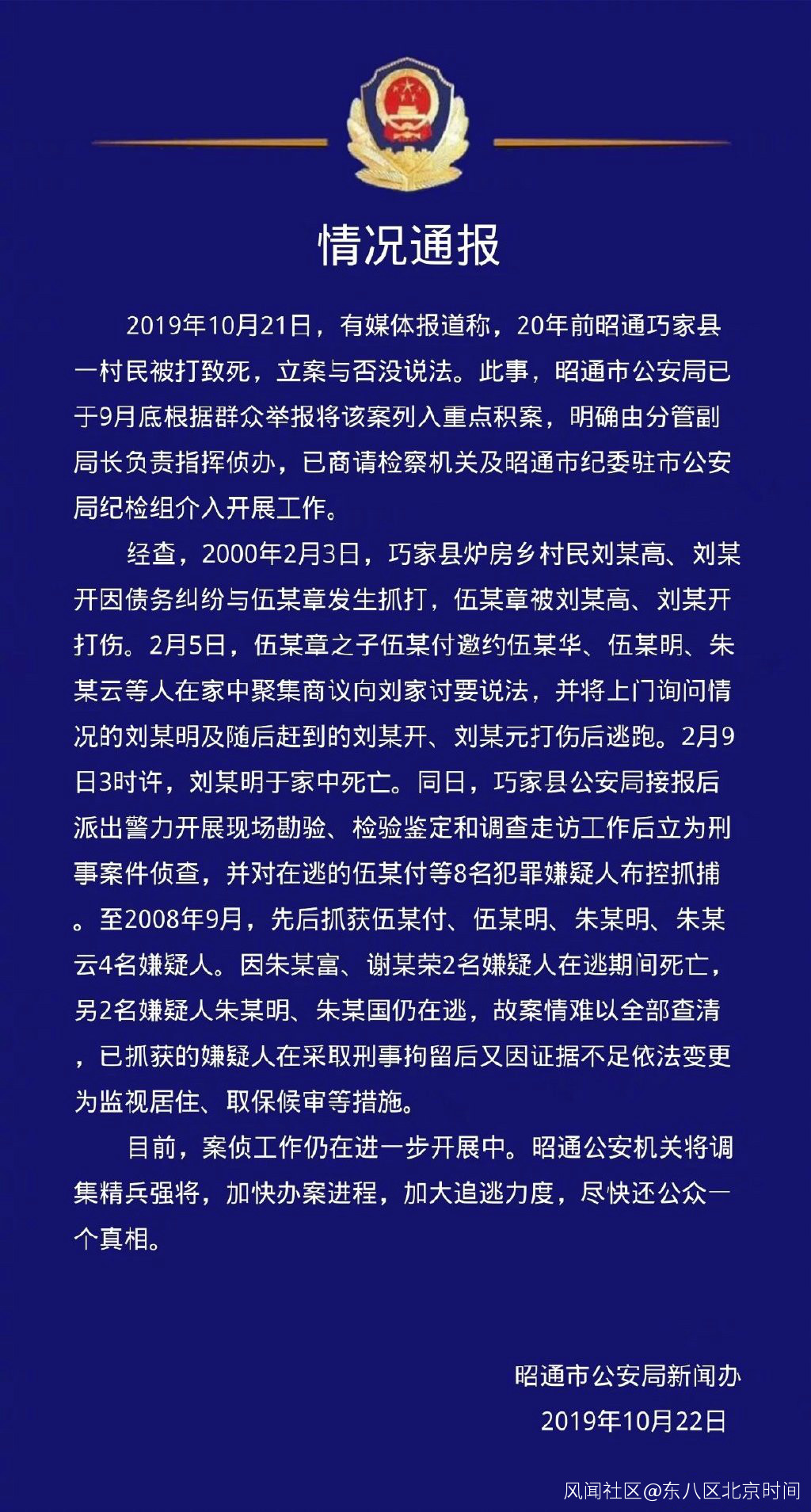 10月22日凌晨,針對有媒體報道,雲南昭通巧家縣“20年前一村民被打致死,兇手無一被問責”一事,昭通市公安局通過其官方微信公號“昭通警方”通報稱,市公安局已於9月底根據羣眾舉報將該案列入重點積案,明確由分管副局長負責指揮偵辦,已商請檢察機關及昭通市紀委駐市公安局紀檢組介入開展工作。