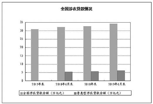 金融支持鄉村振興力度不斷加大。截至2019年6月末,全國涉農貸款餘額34.24萬億元,其中,農户貸款餘額9.86萬億元。普惠型涉農貸款餘額6.1萬億元,佔全部涉農貸款的17.8%,較年初增長8.24%,高於各項貸款平均增速1.11個百分點。2019年上半年,全國農業保險為1.17億户次農户提供風險保障約2.57萬億元,為1500.52萬户次受災農户支付賠款203.09億元。
