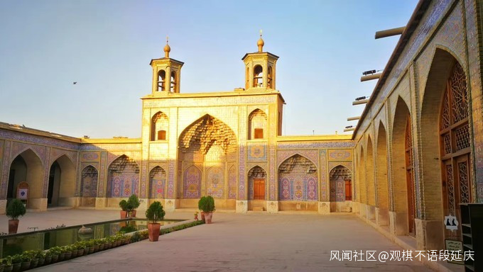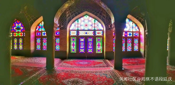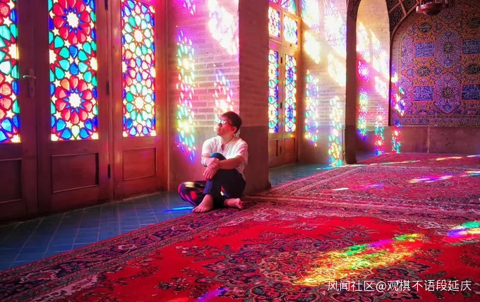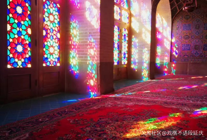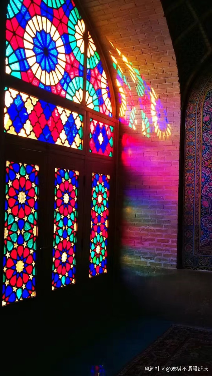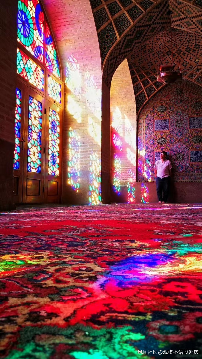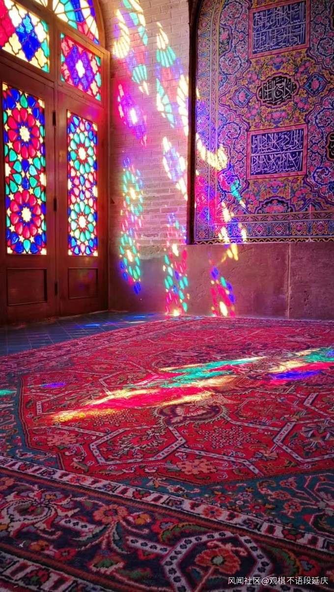 Nasir al-Mulk清真寺(江湖人稱 粉紅清真寺 )。該寺於1888年竣工,位於伊朗南部經濟中心設拉子。因為其外牆釉色中以粉紅色最為出挑,所以也被人叫做 粉紅清真寺, 至今仍保存完好。它的冬季禱告室世界聞名,來自世界各地的人們,帶着手機、相機來朝聖。清真寺夏天7點半開門,因為住的民宿只隔一條街,七點就溜達到了門口。沒有傳説中的看門老大爺,自然也沒有傳説中的早開門,7點半準時開門,一縷陽光剛剛照到正面的建築,右側的冬季禱告室,沒有一絲陽光。。
