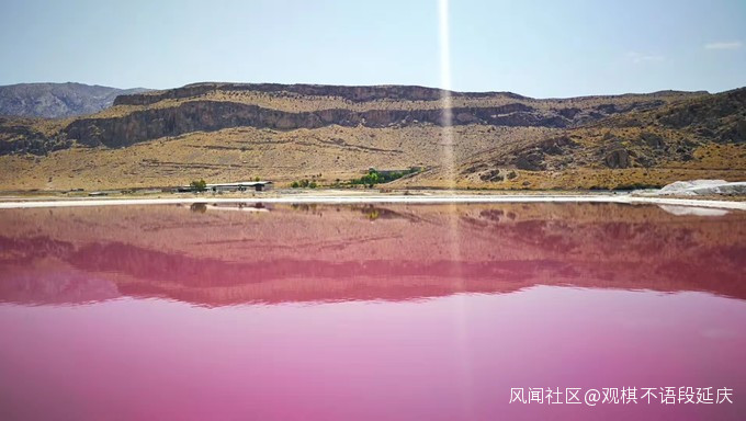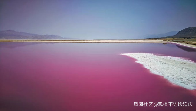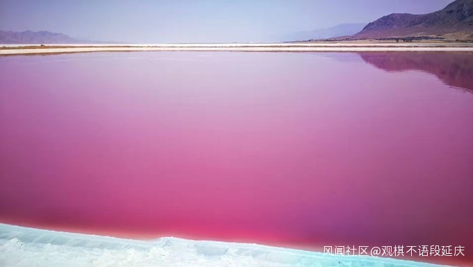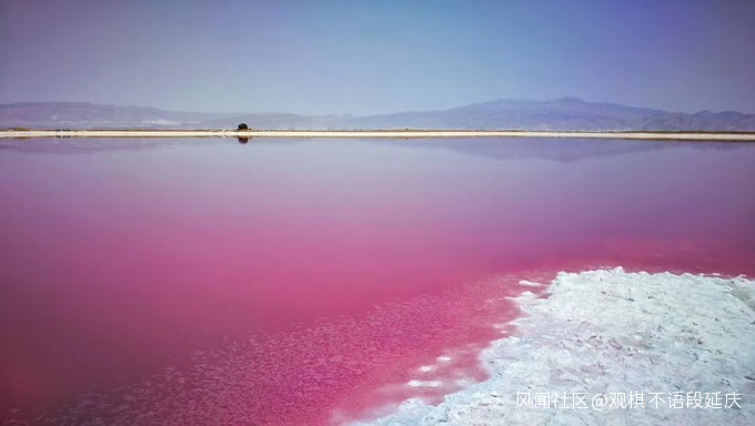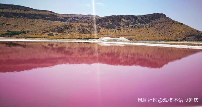 而近處數百畝的方塘,粉色湖水波瀾不驚,與藍天、荒山的倒影相映成趣。