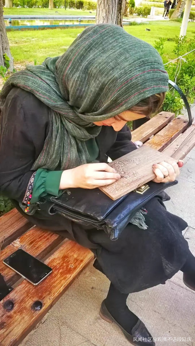 非常恬靜優雅的一位女孩,在哈菲茲墓,一個人,靜靜地以刀為筆,雕刻一幅作品。