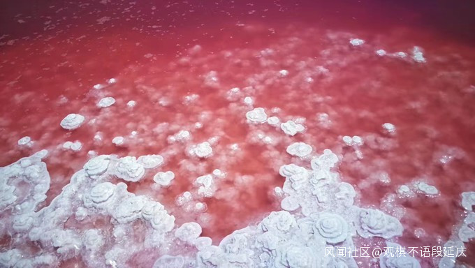 近岸處,鹽的濃度加大,結出朵朵白色靈芝,綴在粉色的湖面上。
