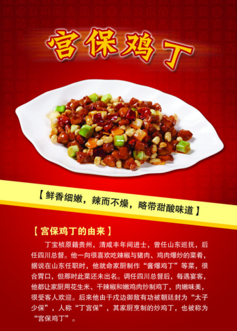 七、**菜單上經常出現的菜名錯誤是:“宮保雞丁”錯成“宮爆雞丁”。**不少人誤以為此菜出自宮廷,其烹飪方式是爆炒,因而得名“宮爆”。其實,正確的寫法應是“宮保雞丁”,它的得名和清代丁寶楨有關。此人曾官封太子少保,被尊稱為“丁宮保”。據説,丁寶楨的家廚擅長花生炒雞丁,後來這道菜由丁府傳到民間,因此得名“宮保雞丁”。