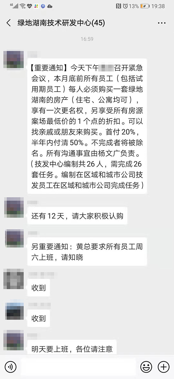上述員工稱,上週其所在中心負責人“梅總”在微信工作羣裏發佈“重要通知”:“今天下午黃總召開緊急會議,本月底前所有員工(包括試用期員工)每人必須購買一套綠地湖南的房產(住宅、公寓均可),享有一次更名權,另享受所有房源案場最低價的1個點的折扣。可以找親戚或朋友來購買。首付20%,半年內付清50%。不完成者將被除名。(技發中心編制共26人,需完成26套任務)。”