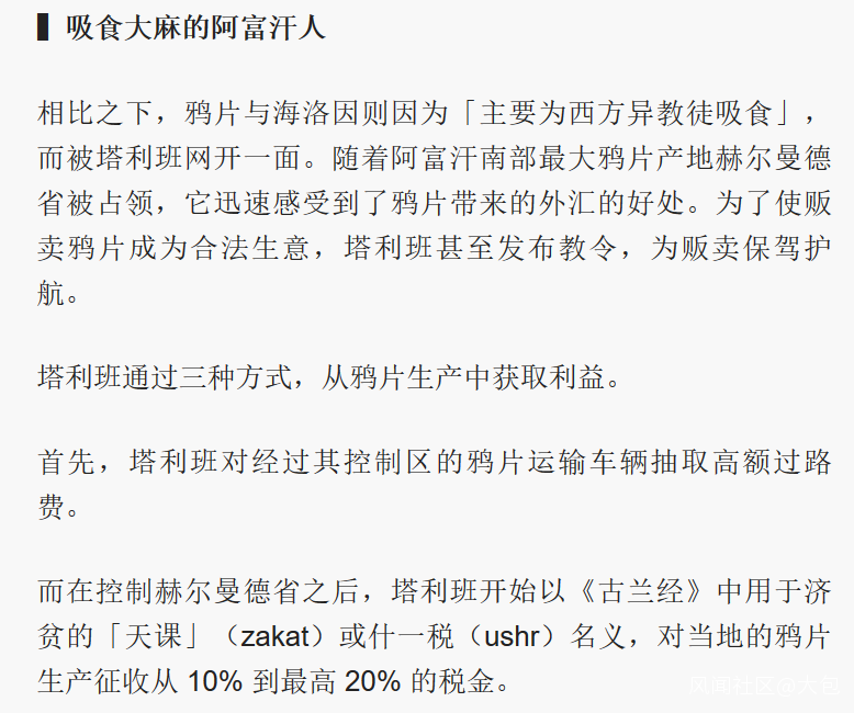 事實是什麼呢?阿富汗人主要吸食的是大麻,鴉片不是國內禁毒的重點。而塔利班,是自己發現了毒品是維持收入的重要一環,從禁毒者變成了毒品貿易保護者。