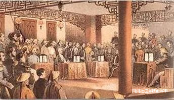 條約簽訂後,英國公使額爾金卻提出要在北京換約。得到應允後,英、法、美三國公使1859年6月進京時,卻未按規定路線行進,僧格林沁視之為侵犯,率兵擊退了這三位不守規矩的公使。