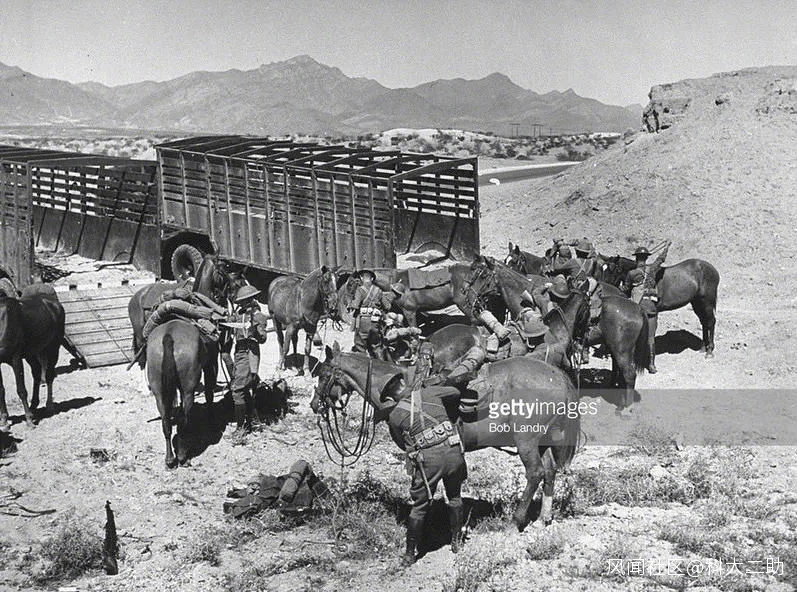 例如這兩張照片,是1941年的美國陸軍第一騎兵師,騎兵們演習時,讓戰馬裝載在卡車上,進行長途運輸,奔襲到戰區,然後在下車騎馬作戰,這樣可以很好的保持戰馬的體力。現代騎兵對馬場馬種和訓練運輸等基礎設施要求相當高,戰馬多不適合長距離行軍。