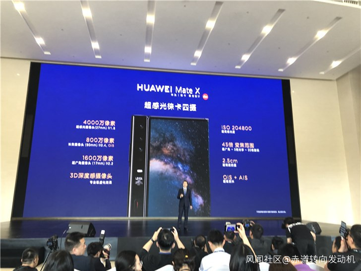 在相機配置方面,搭載4000萬像素超感光攝像頭(27mm)f/1.8,800萬像素長焦鏡頭(80mm)f/2.4支持OIS光學防抖,1600萬像素超廣角鏡頭(17mm)f/2.2,3D深度感攝像頭支持專業級虛化效果。Mate X的鏡頭支持ISO 204800超高感光度,支持45倍變焦範圍(超廣角-3倍光學-30倍數碼),2.5cm超微距拍攝,支持OIS+AIS超級防抖。