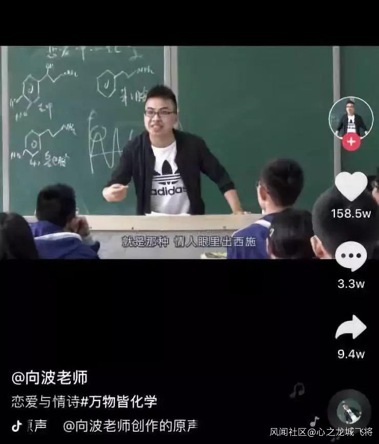 一次,向波錄製了一節“戀愛中的化學”課程。在這個視頻中,他用化學的角度為同學們講解了戀愛——這個在高中時代較為羞澀禁忌的話題。“多情的人其實不能怪他,多巴胺這樣分泌,你能控制住嗎?”視頻中,他用多巴胺的分泌曲線來闡釋了愛情。逗笑同學的同時,也讓他們對戀愛有了正確的認識。