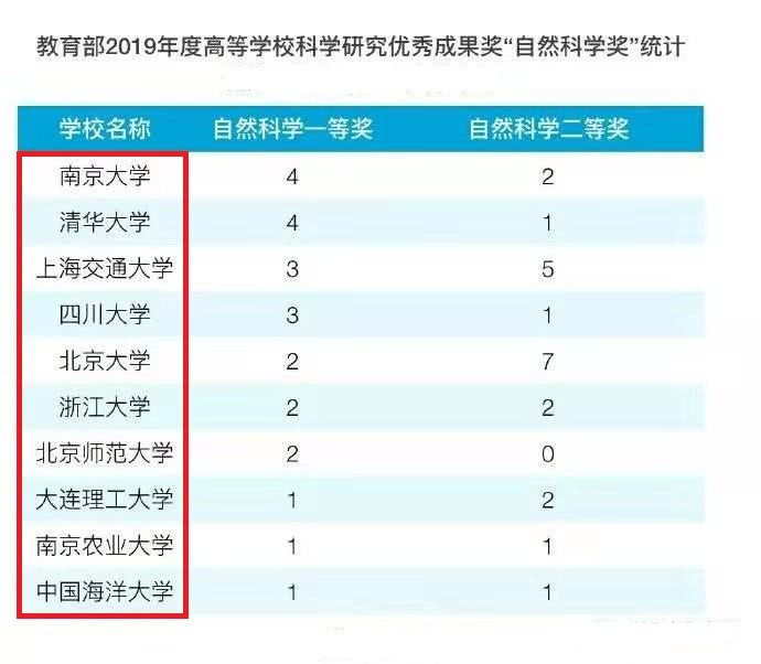 教育部每年都會對外公佈“三大獎”,即高等學校科學研究優秀成果獎(科學技術)分設自然科學獎、技術發明獎、科技進步獎等。這個優秀成果獎在我國還是擁有一定的影響力,它代表着大學在科學技術方面的水平,其中一項重要的獎項就是自然科學獎。