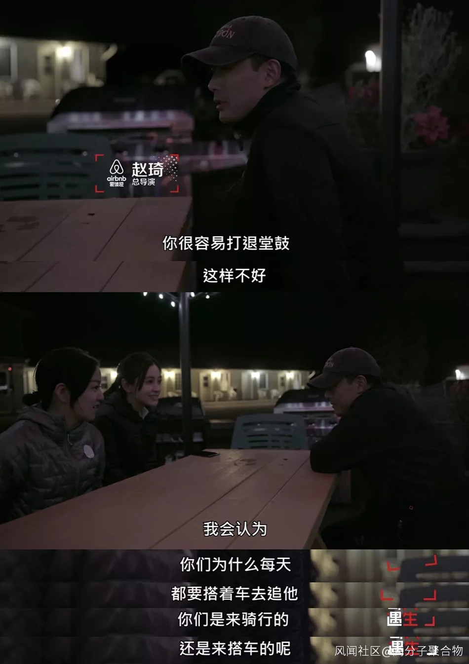 對此,被Angelababy調侃為“冷酷的男人”的導演趙琦,還出鏡直言“批評”Angelababy。他説,“你很容易打退堂鼓,這樣不好,你們為什麼每天都要搭車去追他,你們是來騎行的還是來搭車的呢?”