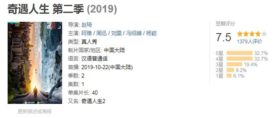 阿雅主持,知名紀錄片製作人趙琦擔任總導演的《奇遇人生》,去年推出第一季後,口碑收益雙贏,目前第一季的豆瓣評分8.9分。《奇遇人生》的節目形式很簡單,就是每一期節目邀請1-2個嘉賓,為他們量身定製旅行目的地,在阿雅的陪伴下,開始這一段旅行。第一季播出時,主創者都還不清楚是否會有第二季,但第一季的成功,讓第二季很快成行。10月22日起,《奇遇人生2》再次出發。