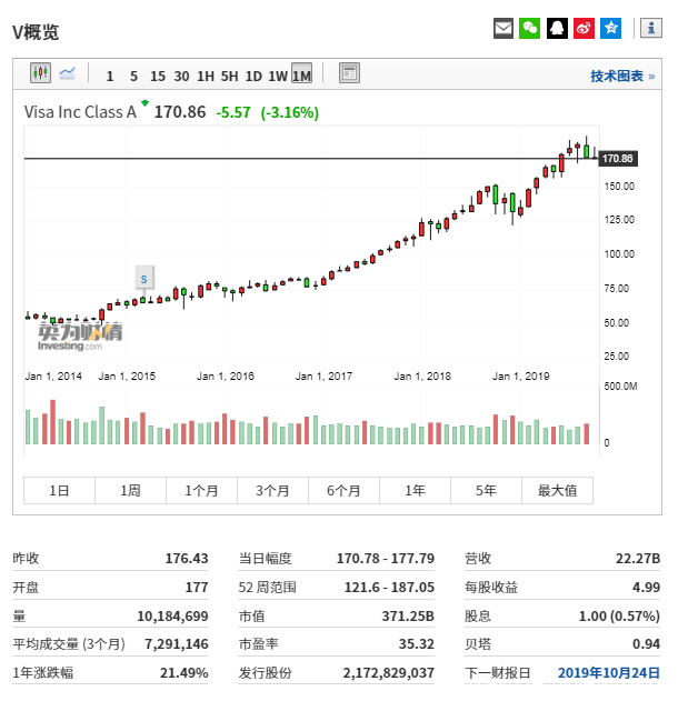 Visa歷史行情圖,來自英為財情Investing.com截至週二收盤,Visa股價報170.86美元,當前市值為3712.5億美元,一年漲跌幅為21.49%,市盈率在35倍左右,貝塔係數為0.94.