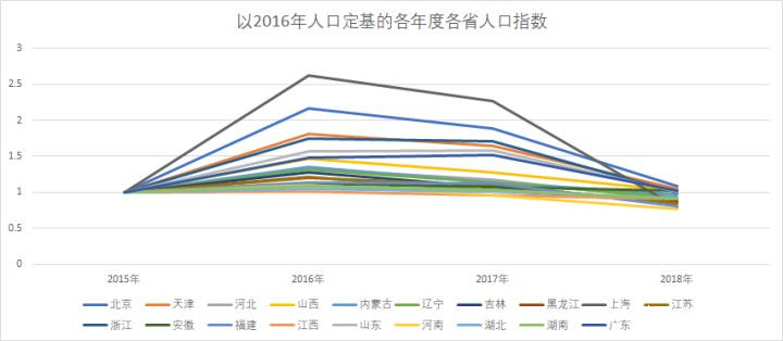 看出什麼了嗎?沒看出來的話再看下圖,以2016年定基的各省人口指數: