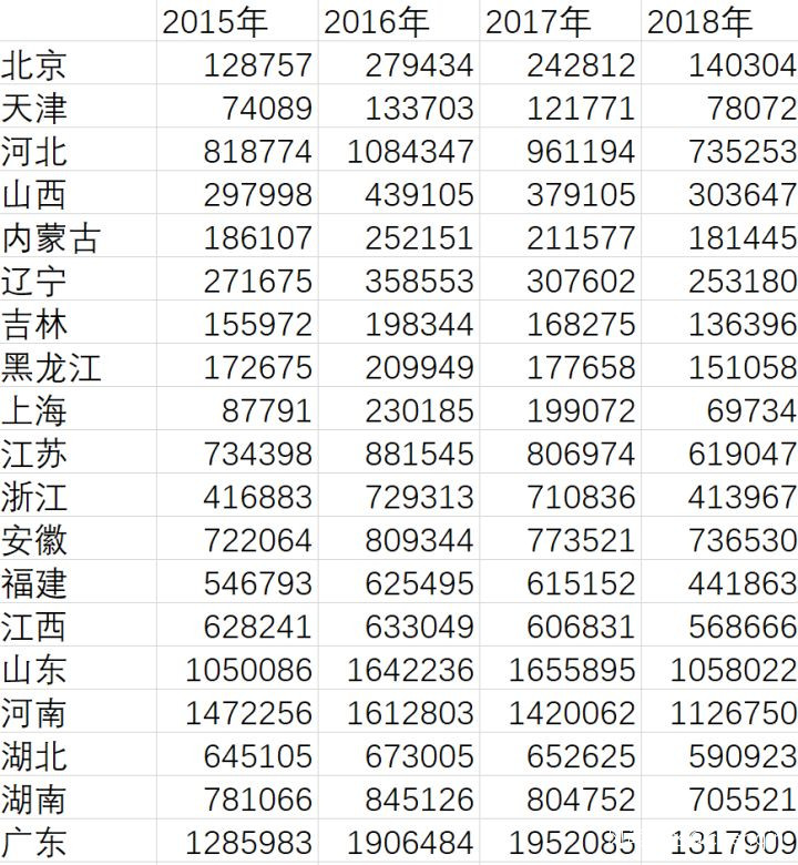 最上面四條線,分別是上海、北京、浙江、天津。都是中國外來人口占比最高的地區。如果你要相信2018年的數字和2017、2016年的數字是一個口徑,那你得先説服自己——上海市人口2016年比2015年上升了160%,從8.7萬上升到23萬;然後2018年比2017年下降了65%,從20萬下降到7萬。類似的還有北京,現上漲一倍再下跌一半。你要是能説服自己相信這個,那我算你贏了。