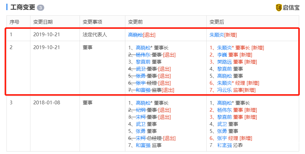 啓信寶數據顯示,10月21日,高曉松卸任北京阿里巴巴音樂科技有限公司董事長、法定代表人,由阿里巴巴創新業務事業羣總裁朱順炎接棒。與此同時,阿里巴巴CEO張勇、阿里巴巴CFO武衞等退出董事,新增董事包括阿里文娛總裁樊路遠。