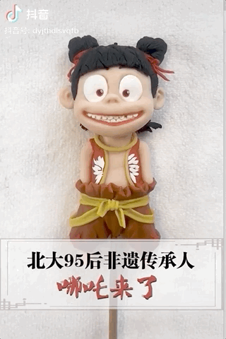 前段時間電影《哪吒魔童降世》,讓那個畫着煙燻妝,敢愛敢恨的哪吒迅速火爆。郎佳子彧緊跟着創作了麪人版的哪吒和敖丙,有13萬人點贊,成為了他在抖音上第一個走紅的視頻。
