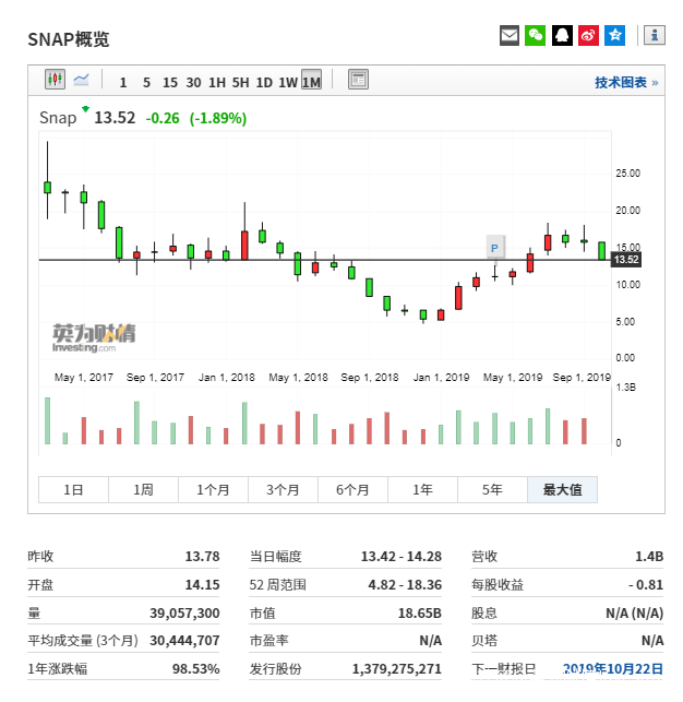 Snap股價歷史行情圖,來自英為財情Investing.com值得注意的是,我們在9月中旬曾經撰文《Snap飆漲200%後,何以支撐高溢價?》提出,Snap的估值已經過高,要支撐這一估值,公司仍然需要更強勁的業績。這段時間以來,一路狂飆的Snap股價累計下跌了近20%。根據英為財情Investing.com的歷史數據顯示,到目前為止,還有近40%的距離,那麼,Snap的投資者也許會期待,公司的三季報能否亮出靚麗的業績,以支撐Snap股價更上一層樓,一舉站上IPO價格以上?