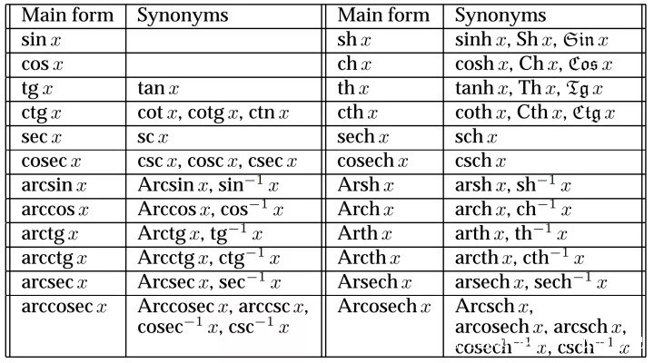 還有就是 tg/ctg 的符號,不過 90 年代末改成 tan/cot 了