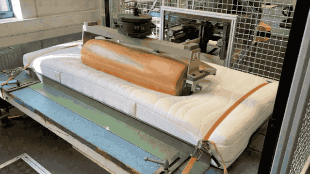 在傢俱實驗室裏,我們還看到了很多技術性測試儀器。比如説平時使用的牀墊,TUV 萊茵在現場展示了一個巨大木質滾筒,它會在牀墊上來回滾動上千次,這也是為了模擬人在牀墊上反覆翻滾的動作,以檢測牀墊的彈性損耗。