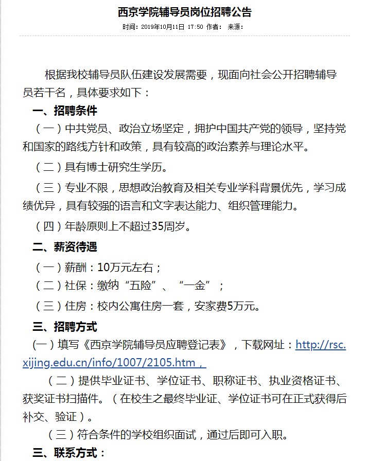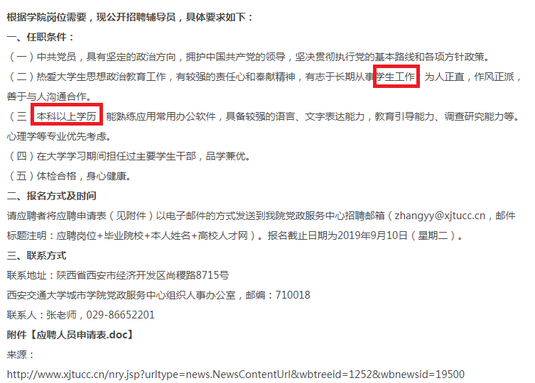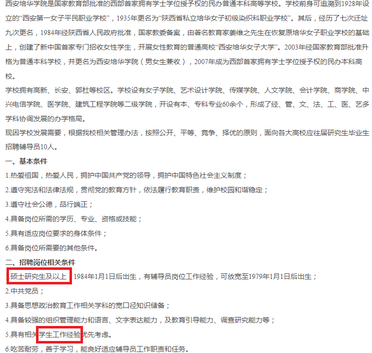 首先看學歷問題,以2019年西安市當地的民辦高校招聘輔導員情況來看,從來沒有要求博士學歷。