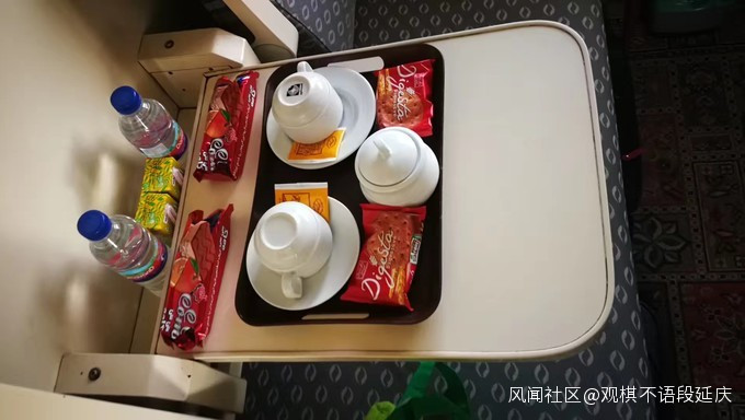 靠椅中間各有茶几,上面擺放的是免費的水、紅茶、飲料和幾種小食品。兩側各有一台液晶電視,可以播放故事片。