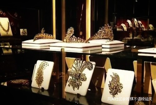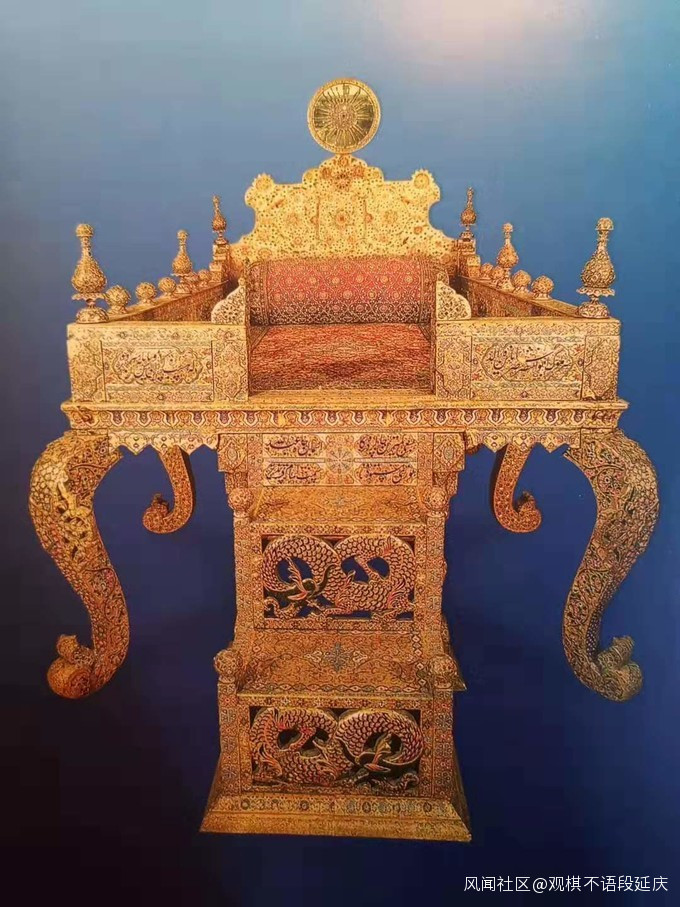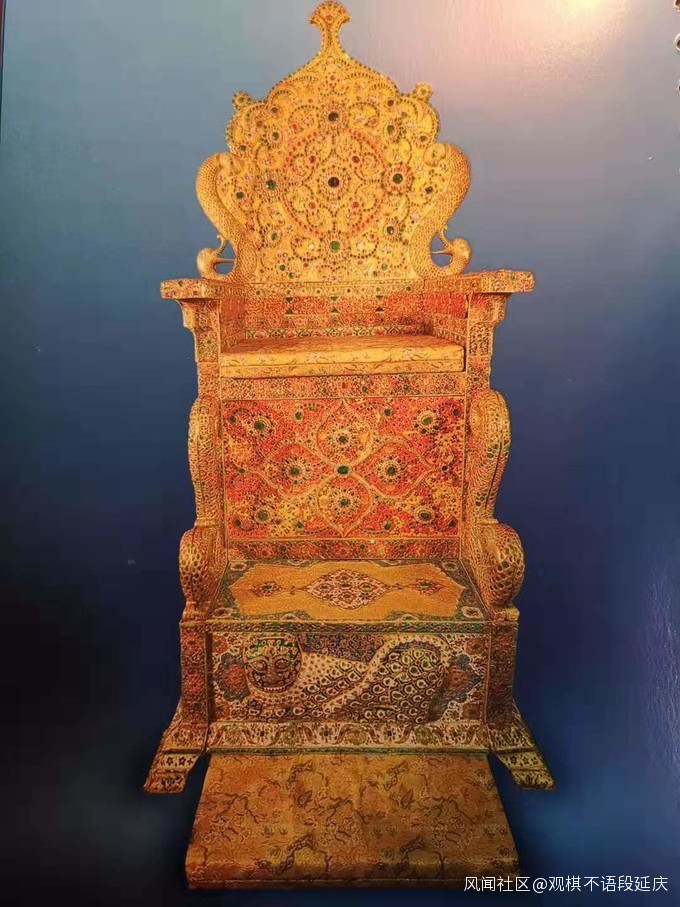 用黃金和寶石打造的“龍椅”,黃金打造的龍椅,高約2米多。上面鑲嵌了各色寶石,