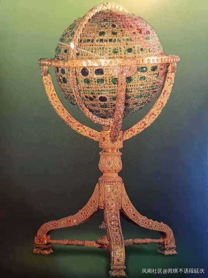 珠寶地球儀,地球儀直徑不到一米,黃金打造,上面陸地是紅寶石,海洋是綠寶石,赤道是白色鑽石。