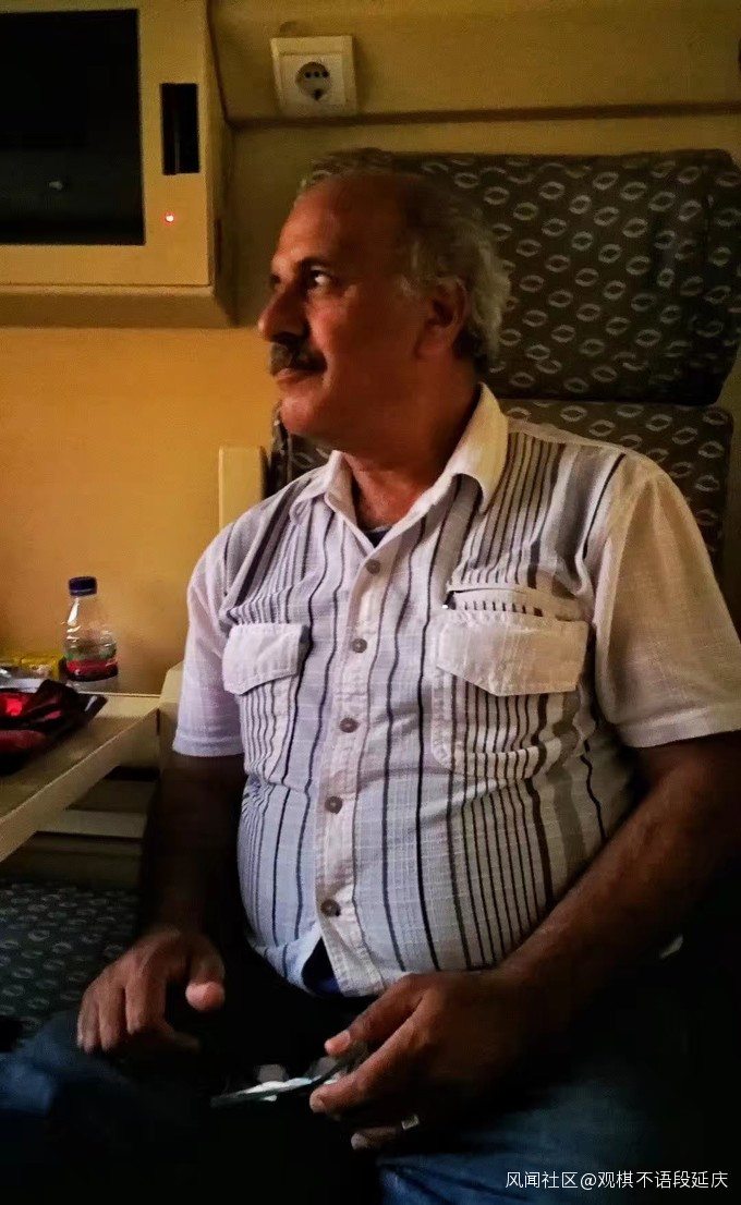 還有一個伊朗人和一箇中國人。乘坐的體驗比印度火車高N個檔次。例如每人配一個專用插座,每人發的牀單和枕套都是新的,每人一個包裹,裏面是棉被和枕頭……想的很細緻,旅客體驗很好。這位伊朗的老兄很不錯,告訴我們火車上的各種設施怎麼用,相當於一位火車導遊。天黑後,停車了,他告訴我們,伊朗人要去做禮拜,要不要去看一看。