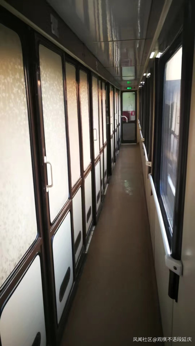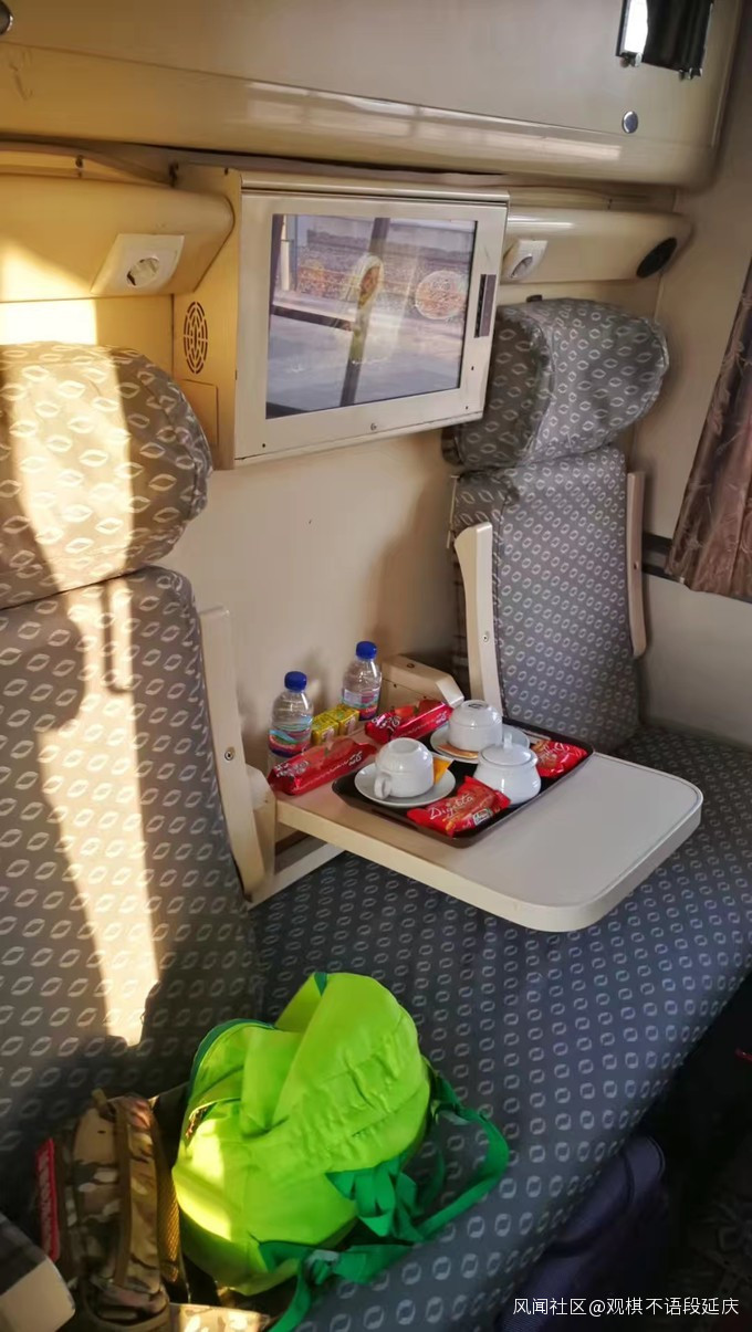 打開包廂大門,兩側上下各兩張牀,白天上牀折起,是四個靠椅。