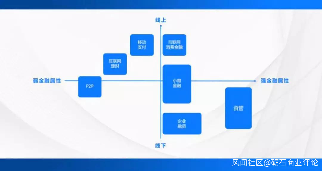 陳生強曾畫過一張四象限圖,按照金融專業性和互聯網屬性對金融行業的所有業務進行了分類,其認為金融機構過去數字化的領域主要集中在第二象限的支付與理財等強線上特徵,弱金融屬性的業務。但在第四象限的資產管理、企業融資與小微金融等強金融屬性,強線下特徵的業務較少涉及。